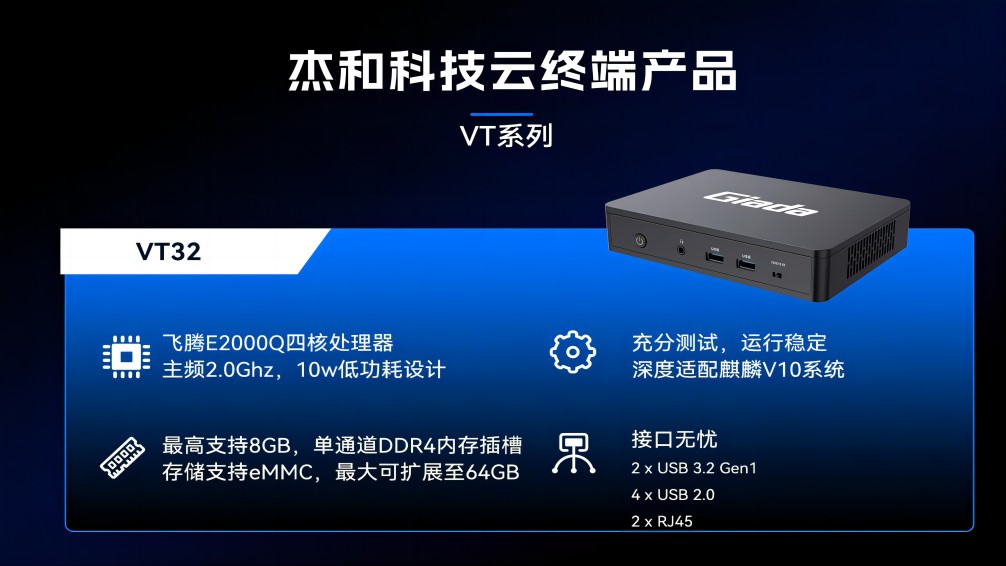 3、VT32作为办公云终端,能从系统层面保障敏感业务数据的安全,搭载的飞腾芯片是国产芯片的代表之一,其具备完善的数据加密与传输机制,确保数据不出境,符合政务数据安全管理的严格要求。