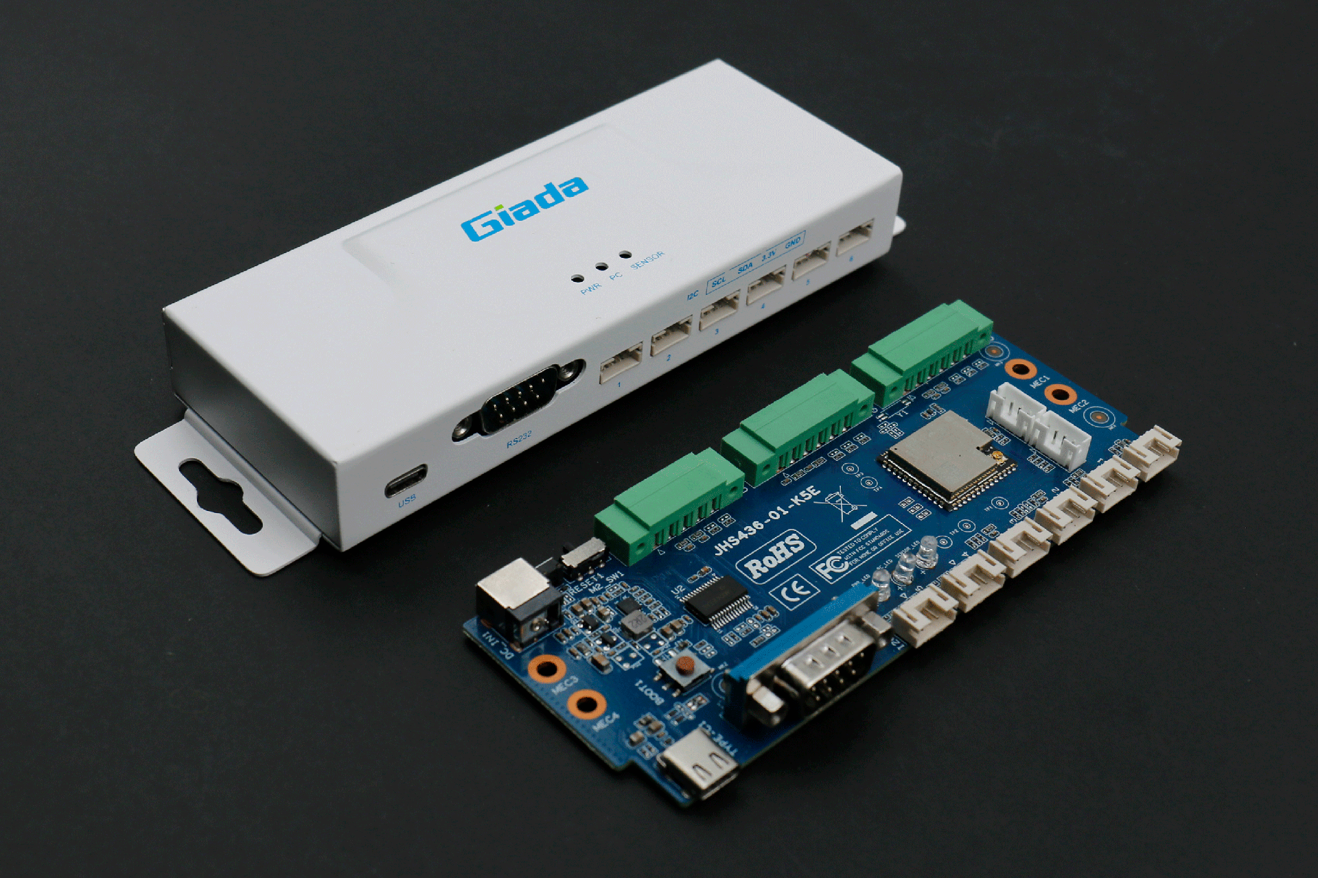 南宫NG·28(中国)相信品牌力量RD01接口丰富,正面配备1个USB Type-C,用来与媒体播放器通信(USB串口)和供电;1个RS232 串口,采用 DB9 端子,支持 DTS 和 CTS 信号,可用来与媒体播放器通信;6个I2C接口,采用6组HY2.0-4PIN端子,用于与传感器通信。在顶部设置3个LED 灯,用于状态指示,LED1通电显示蓝色,LED2与媒体播放器通讯闪烁绿色,LED3与传感器通讯闪烁绿色。
